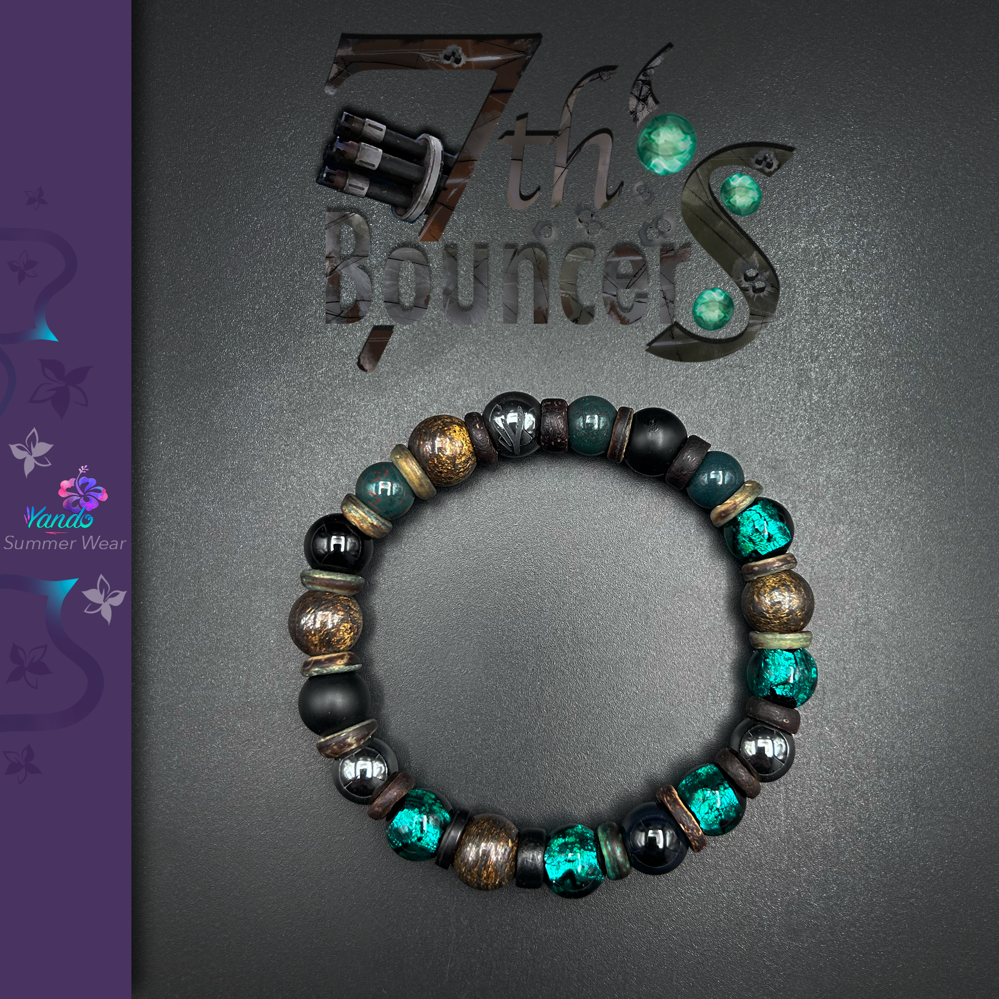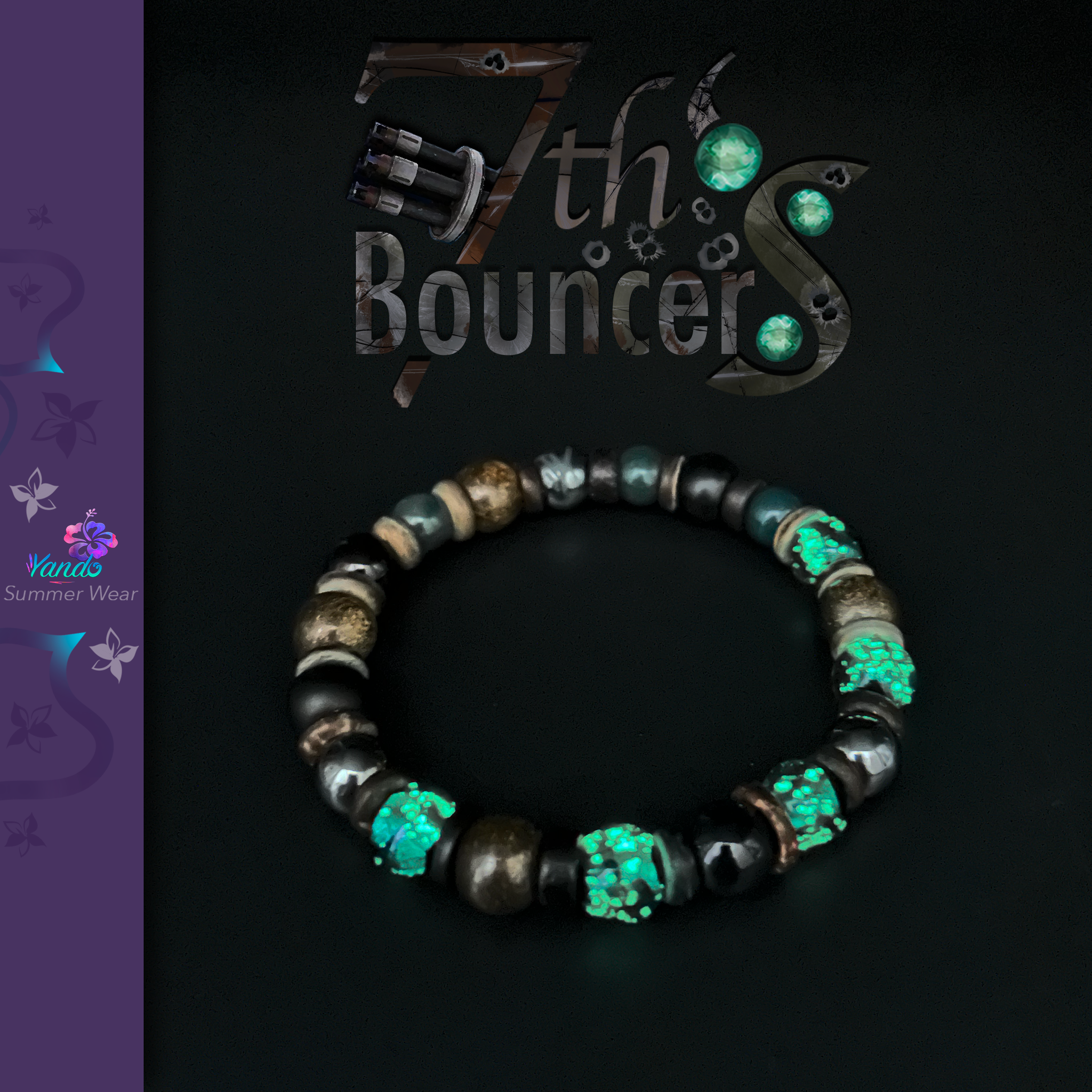 Composition du bracelet : Perle luciole Hotaru Vert Yanbaru, Bronzite, Hématite, Jaspe héliotrope, Onyx, Onyx mat gravé du Y de Yando le tout monté sur fil multibrin doublé. Variations diamètre des perles entre 8mm et 12mm.
