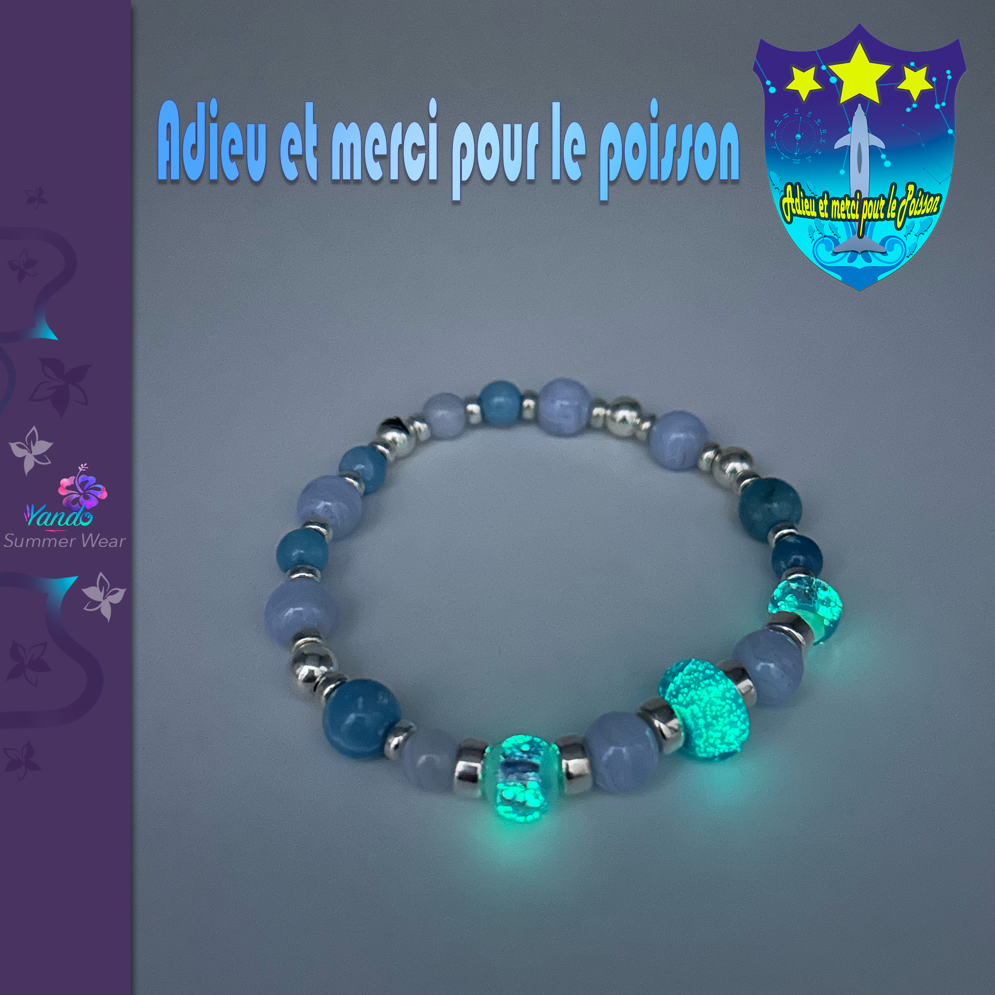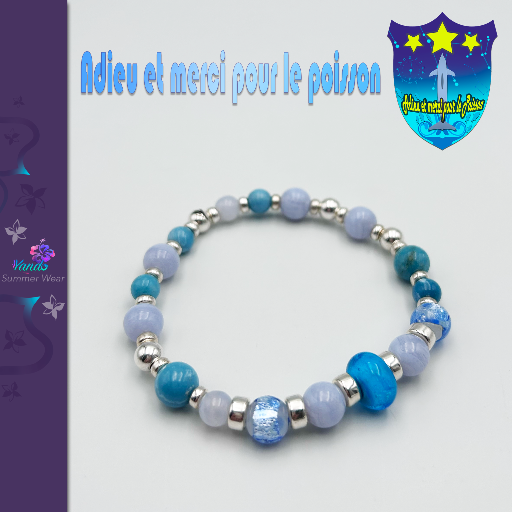 Composition du bracelet : Calcedoine, Larimar, Aigue marine, Argent 925, Hotaru givrée, verrerie fabriquée en France dédiée à la gamme Adieu et merci pour le poisson, rondelles coco dont une gravée Yando le tout monté sur fil multibrins doublé.