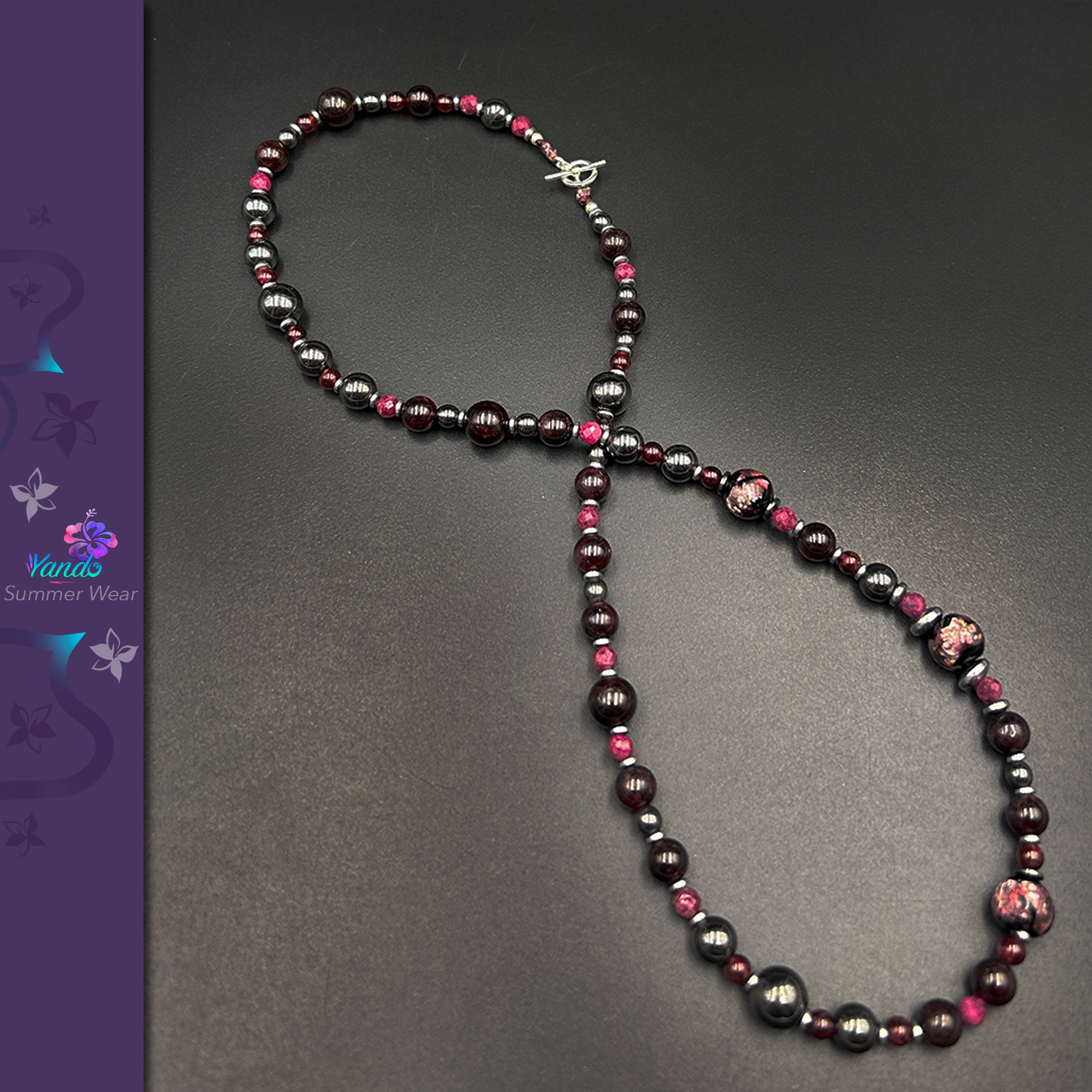 Composition du collier : Grenat, Rubis pierre fine, hématite, Hotaru Rose Murasaki, fermoir argent 925, Hématite gravée du Y de Yando le tout monté sur fil micro-tressé.