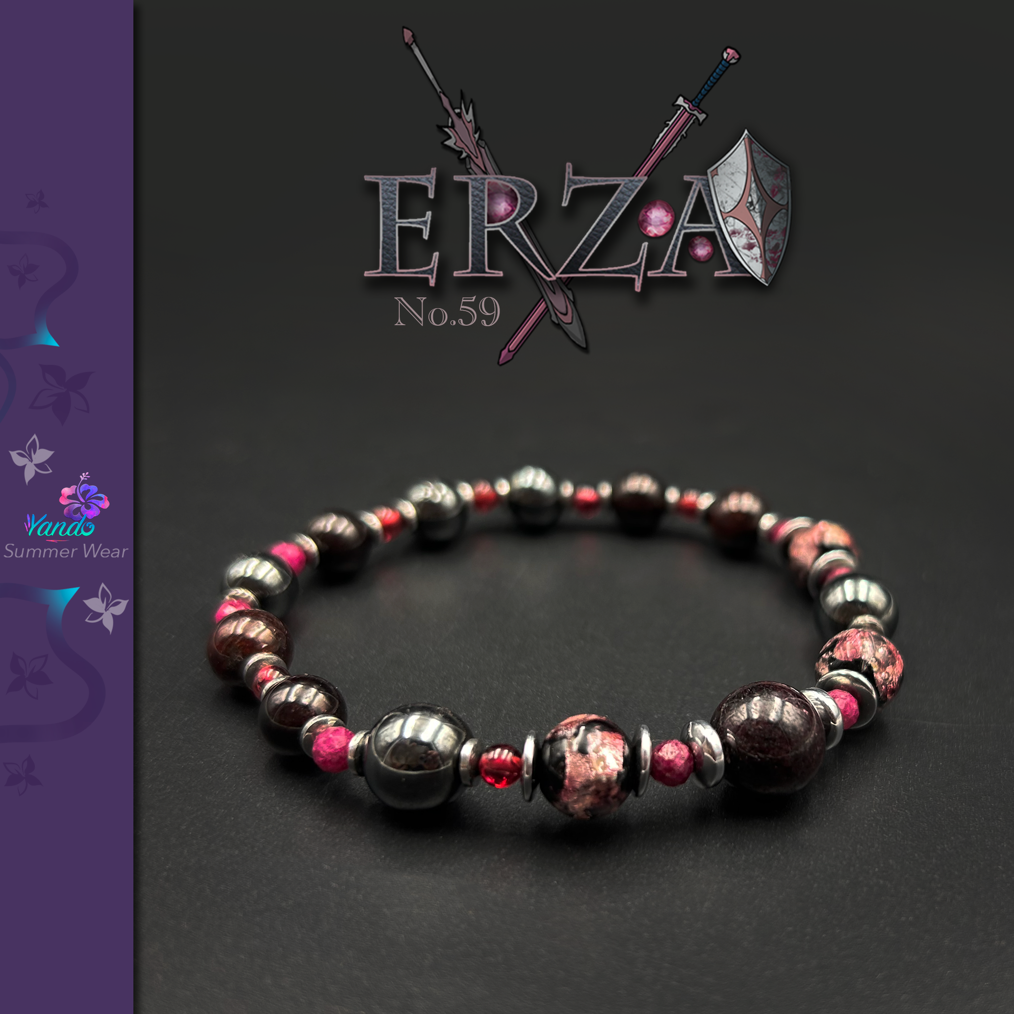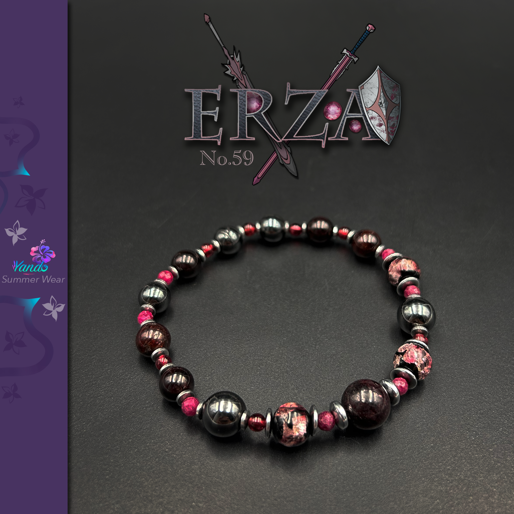 Composition du bracelet : Grenat, Rubis pierre fine, hématite, Hotaru Rose Murasaki, Hématite Y de Yando le tout monté sur fil multibrin doublé.