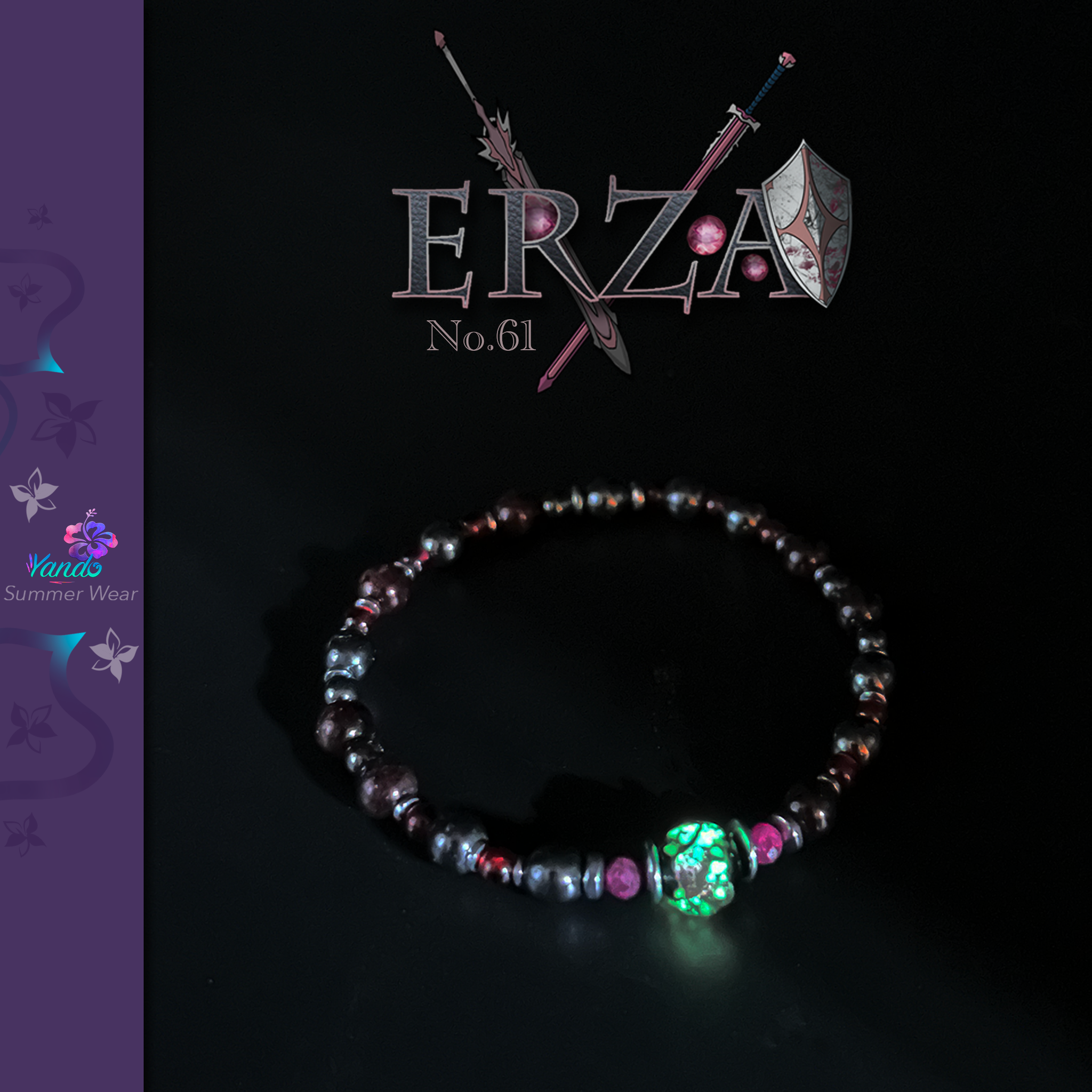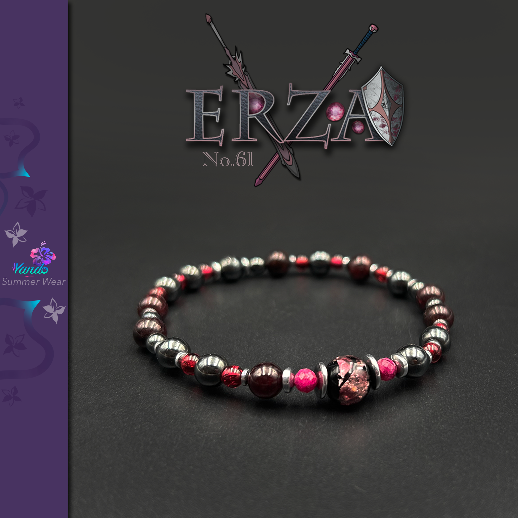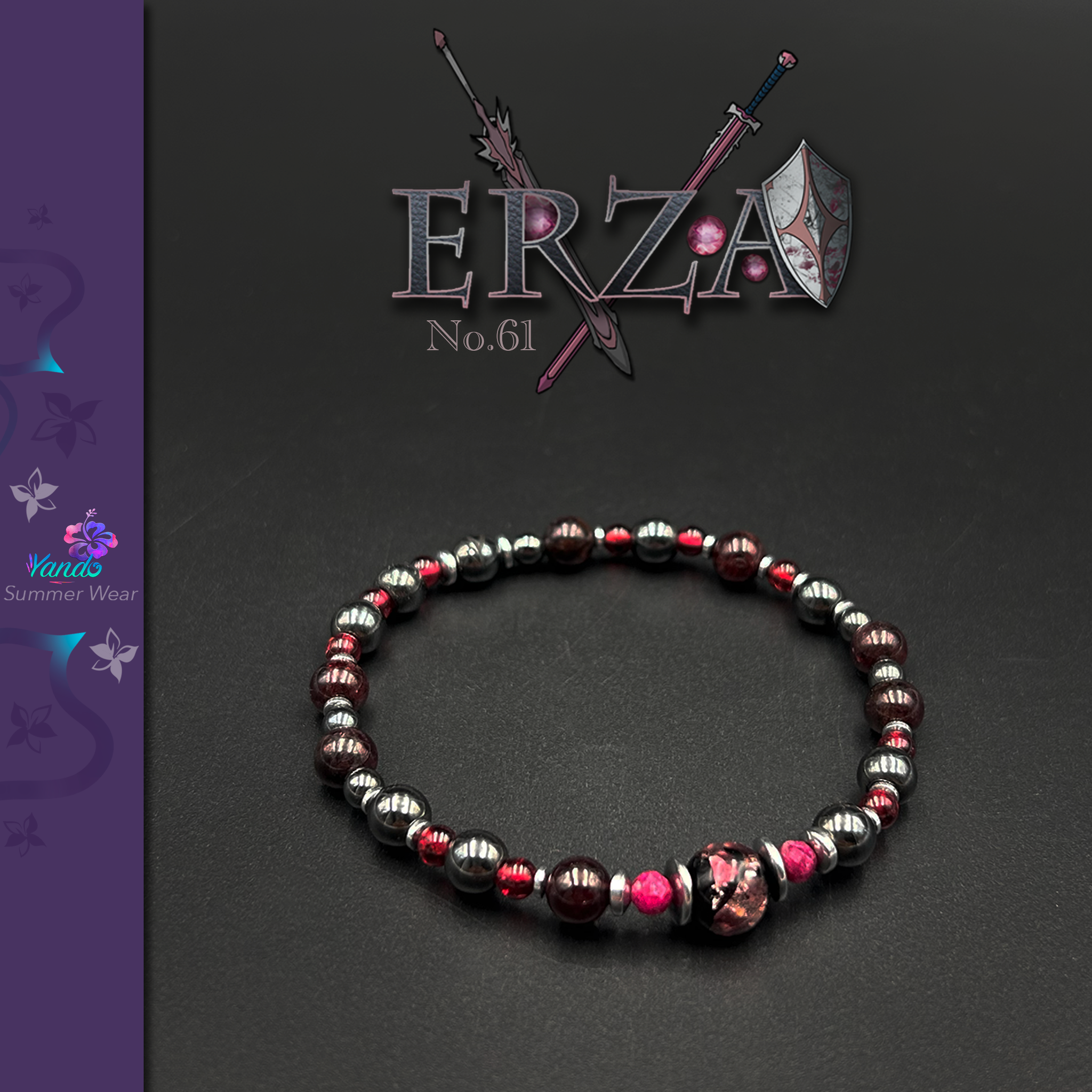 Composition du bracelet : Grenat, Rubis pierre fine, hématite, Hotaru Rose Murasaki, Hématite gravée du Y de Yando le tout monté sur fil multibrin doublé.