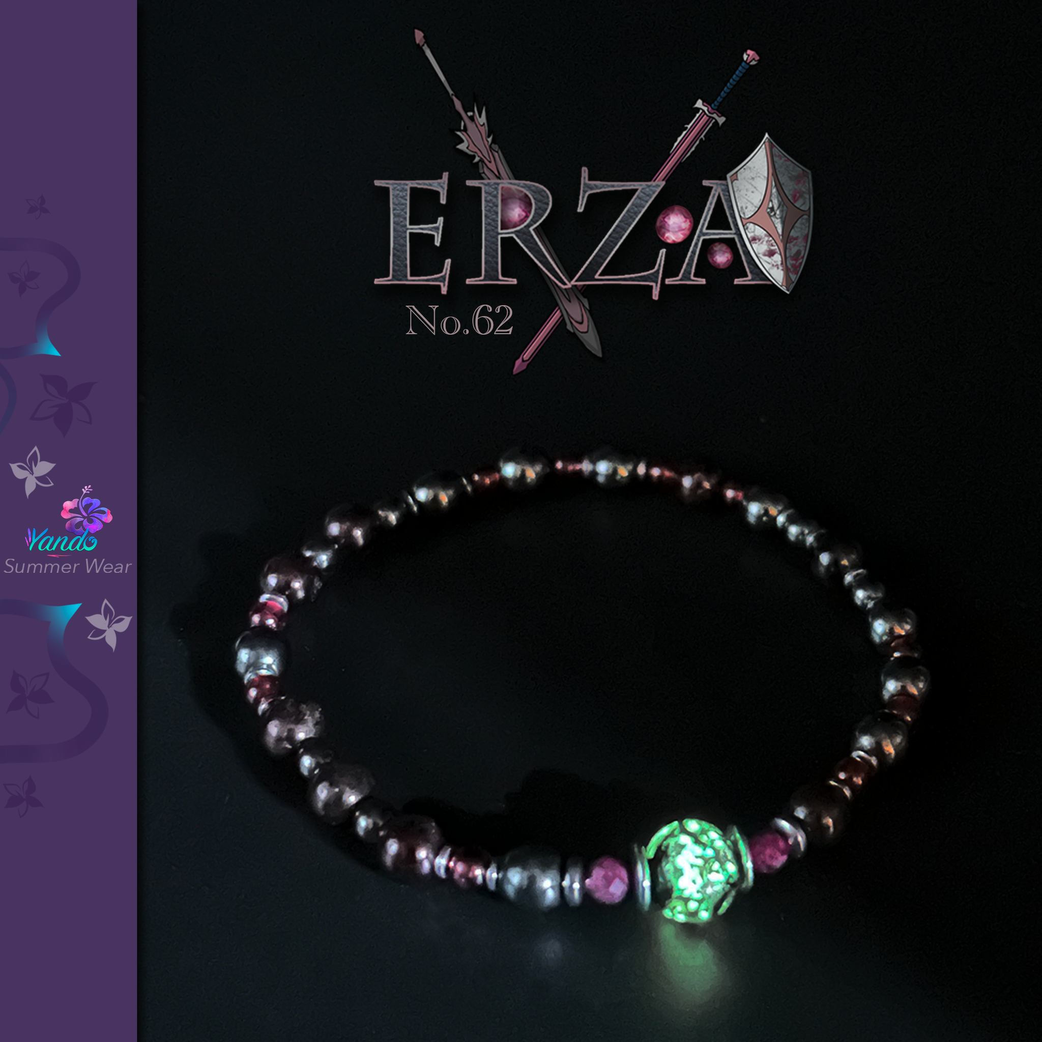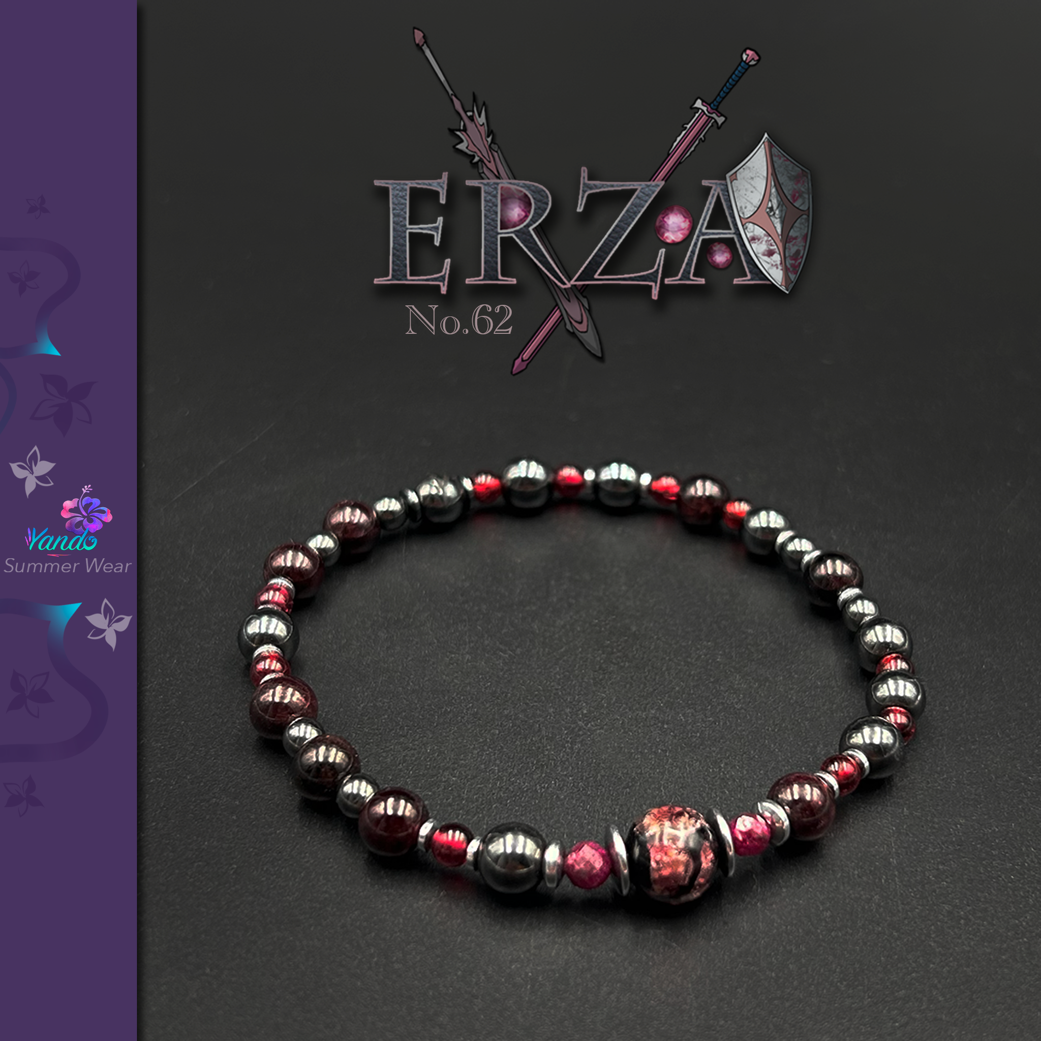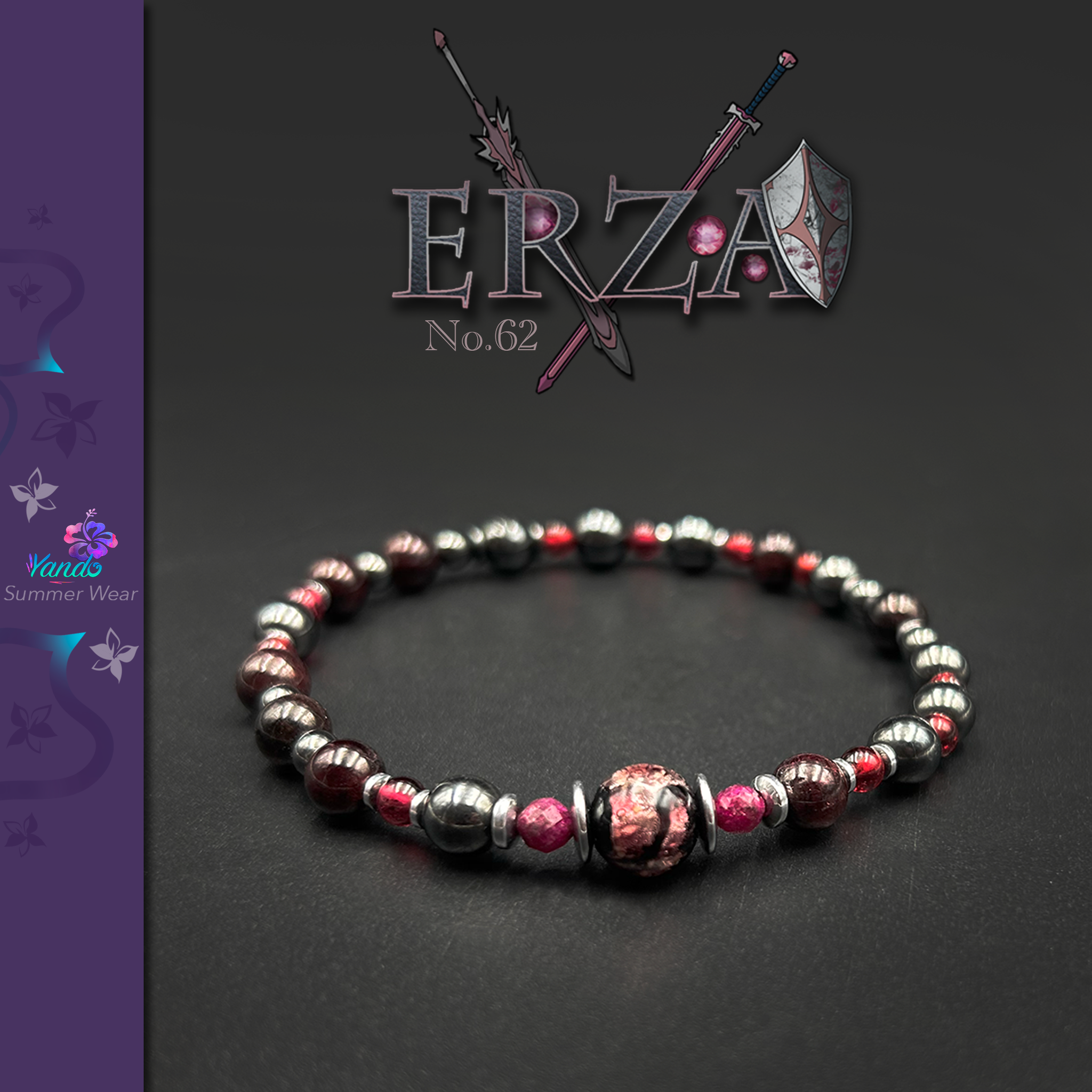 Composition du bracelet : Grenat, Rubis pierre fine, hématite, Hotaru Rose Murasaki, Hématite gravée du Y de Yando le tout monté sur fil multibrin doublé.