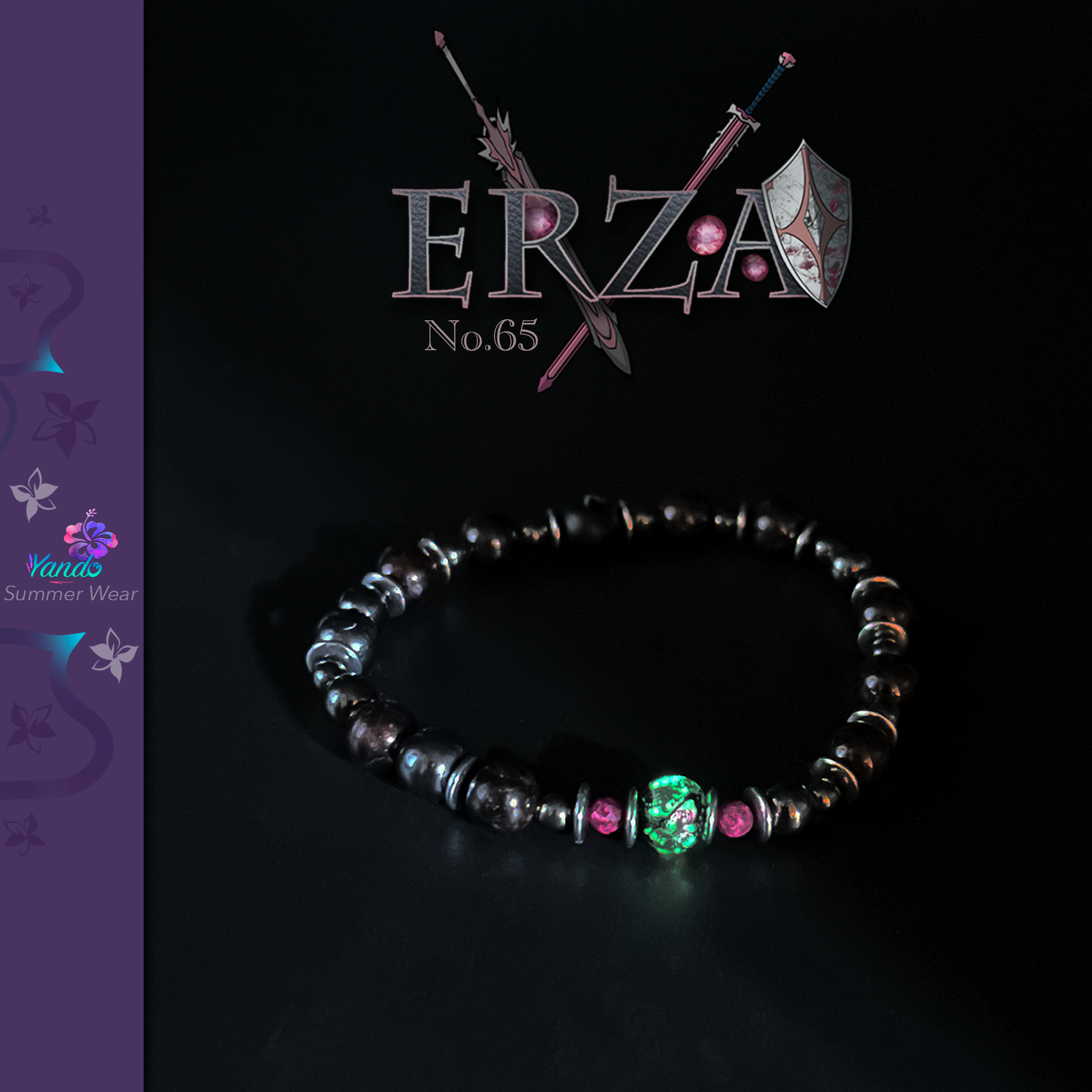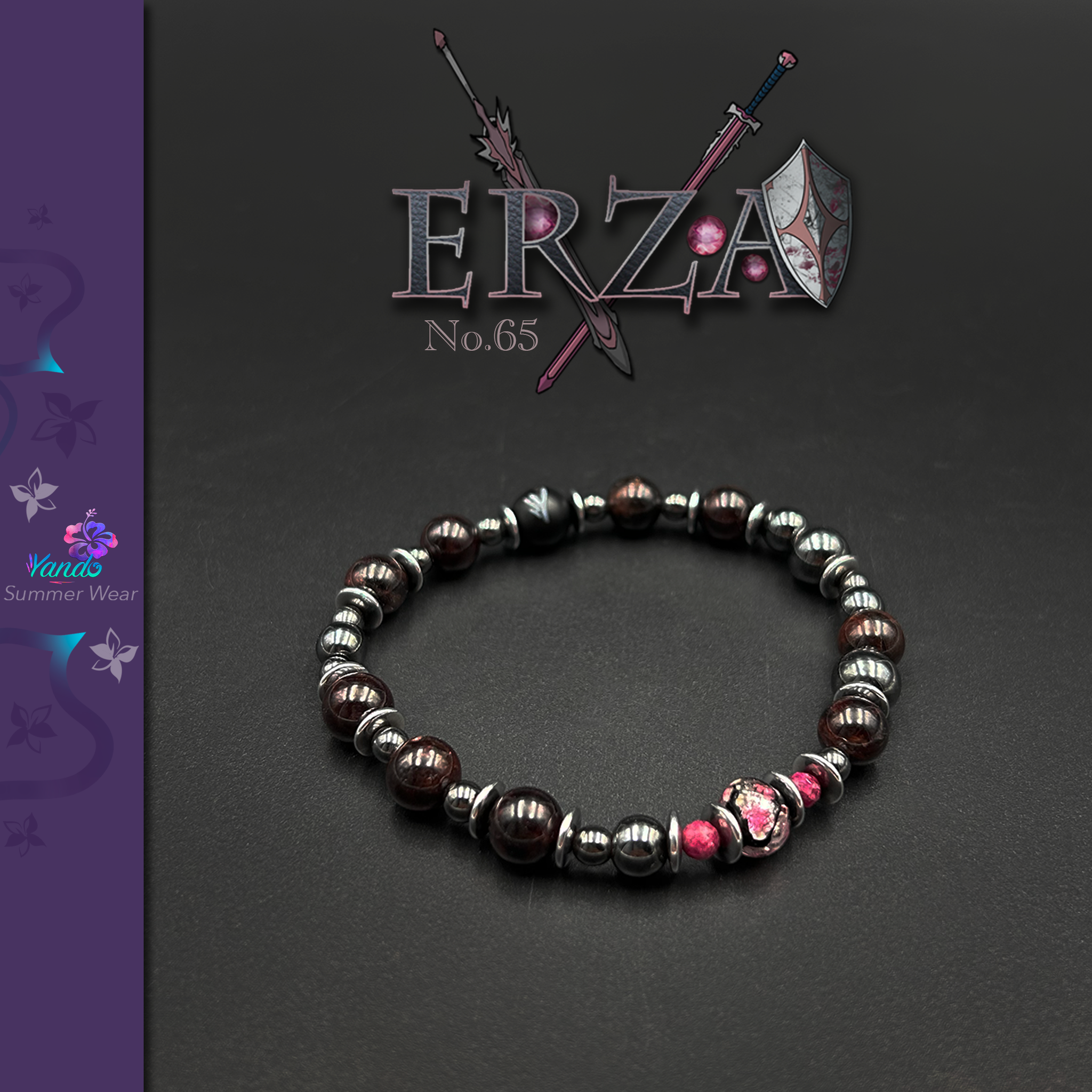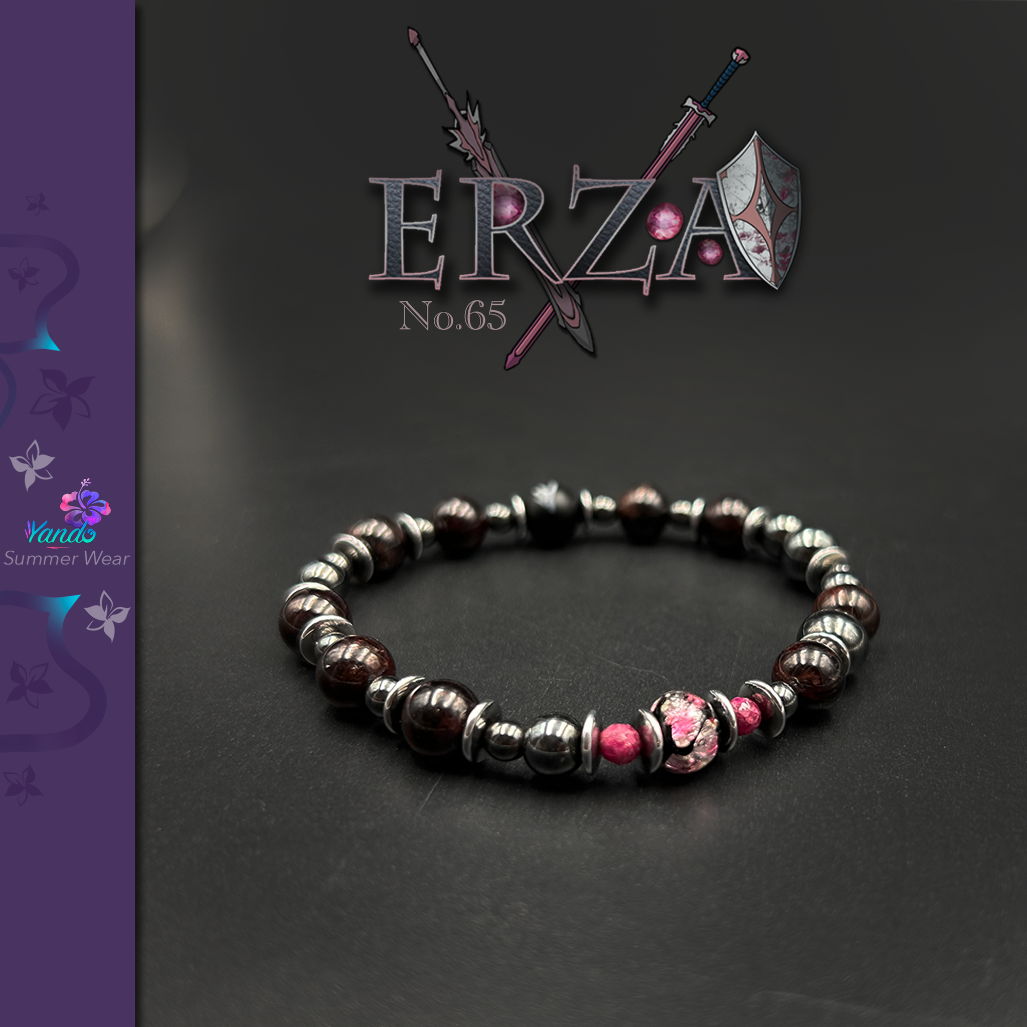 Composition du bracelet : Grenat, Rubis pierre fine, hématite, Hotaru Rose Murasaki, Onyx matte gravé Y de Yando le tout monté sur fil multibrin doublé.