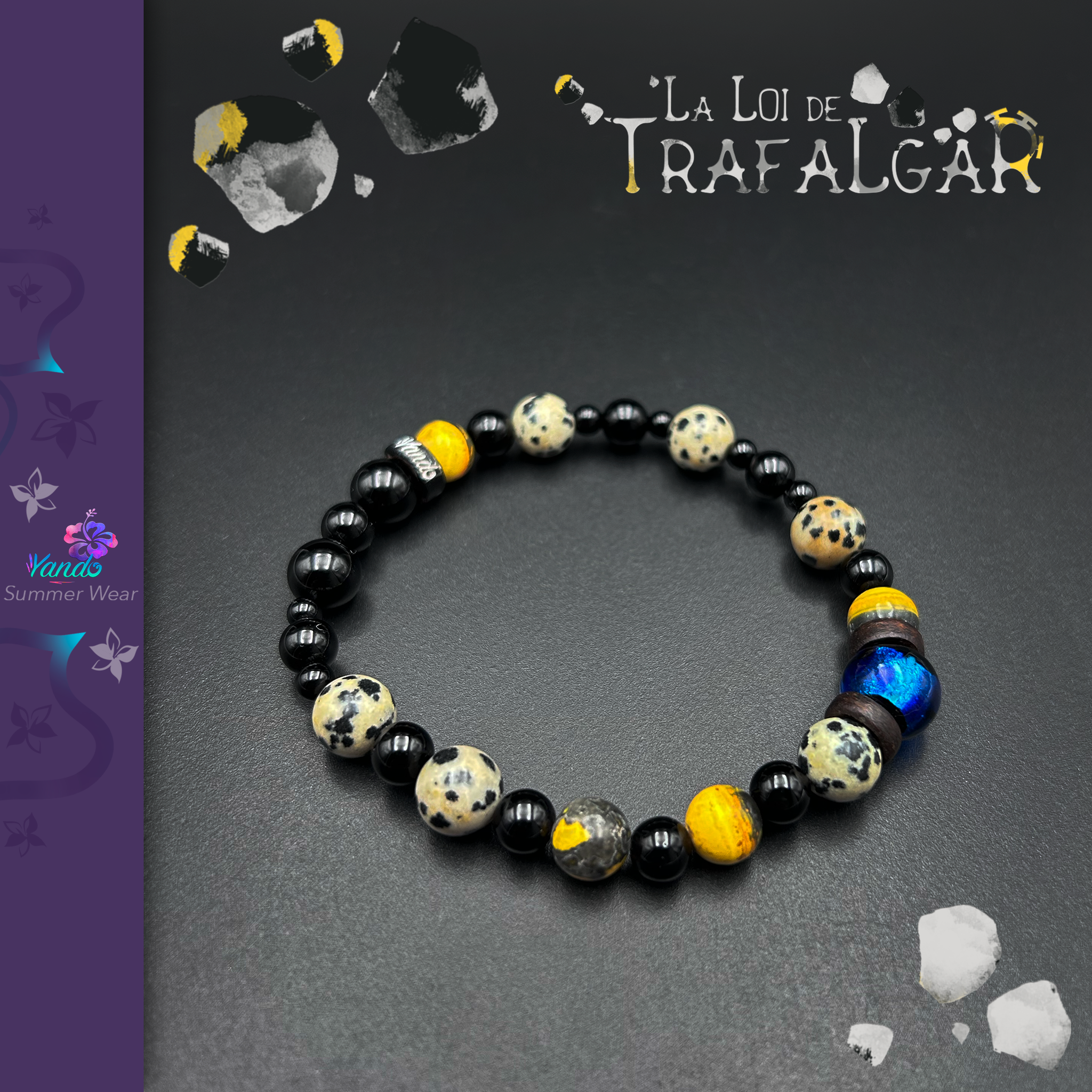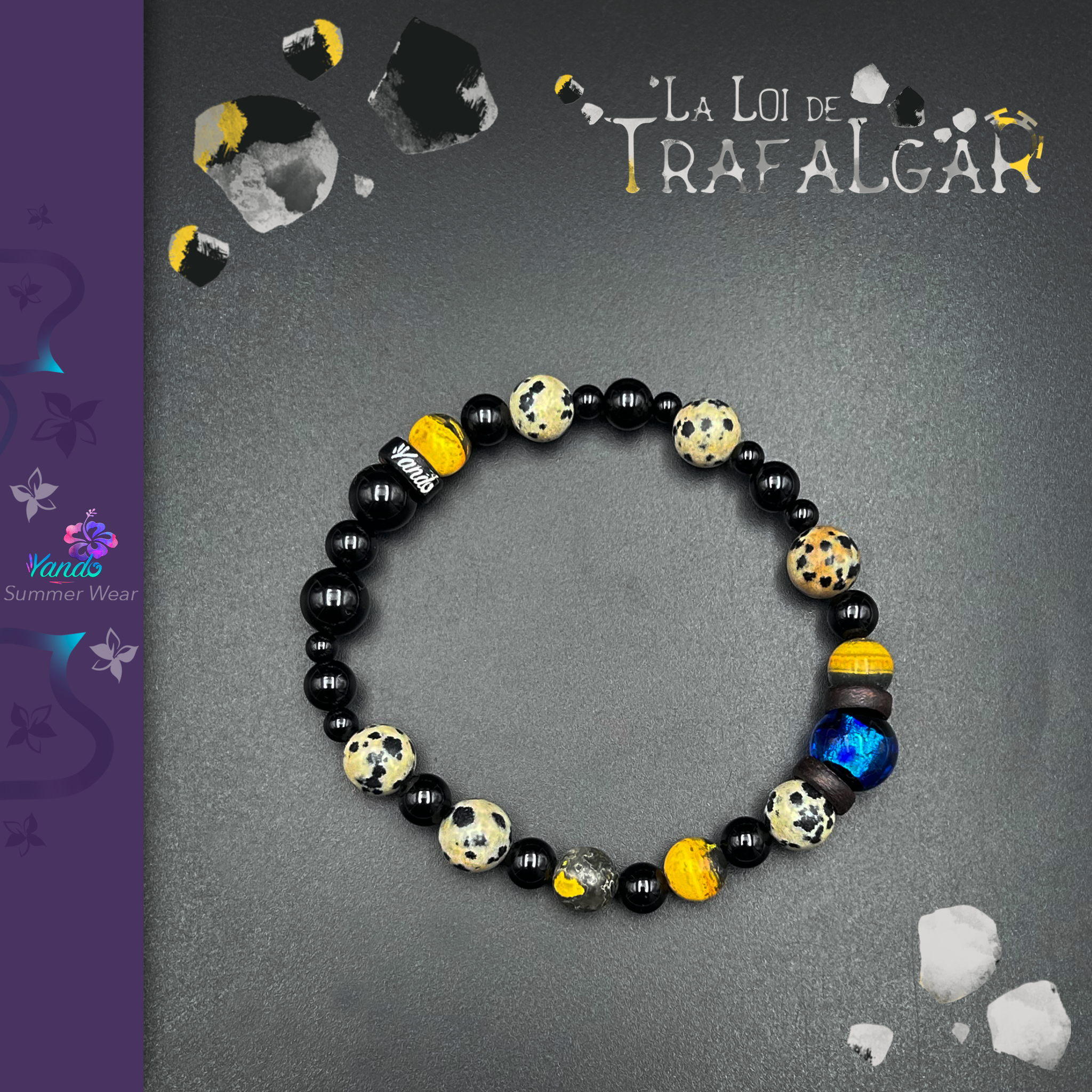 Composition du bracelet : Onyx, jaspe dalmatien, pierre de lave, jaspe bourdon, Hotaru Grand Bleu, rondelle de coconut gravé de Yando, le tout monté sur fil multibrin doublé. Variations du diamètre entre 4mm à 10mm.