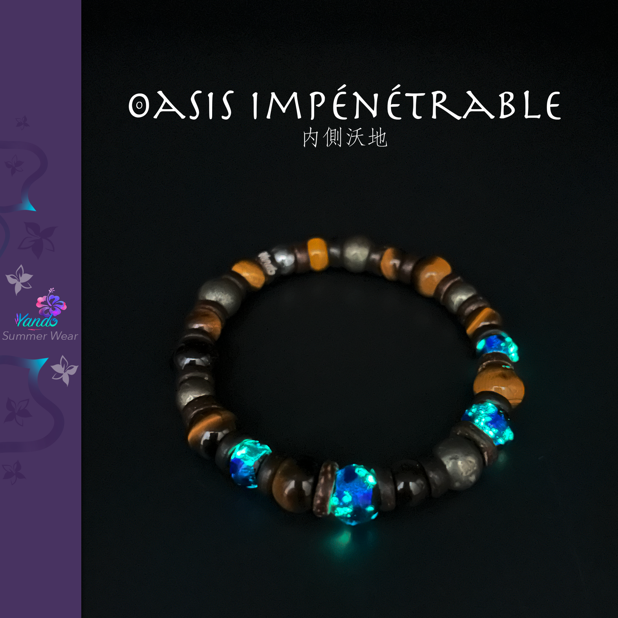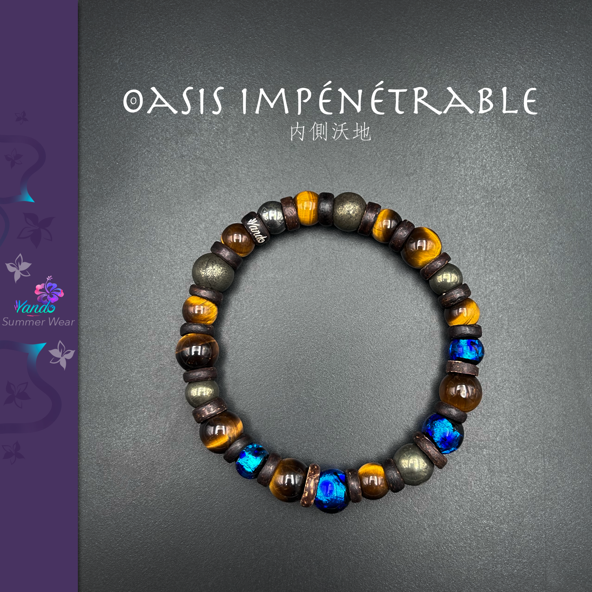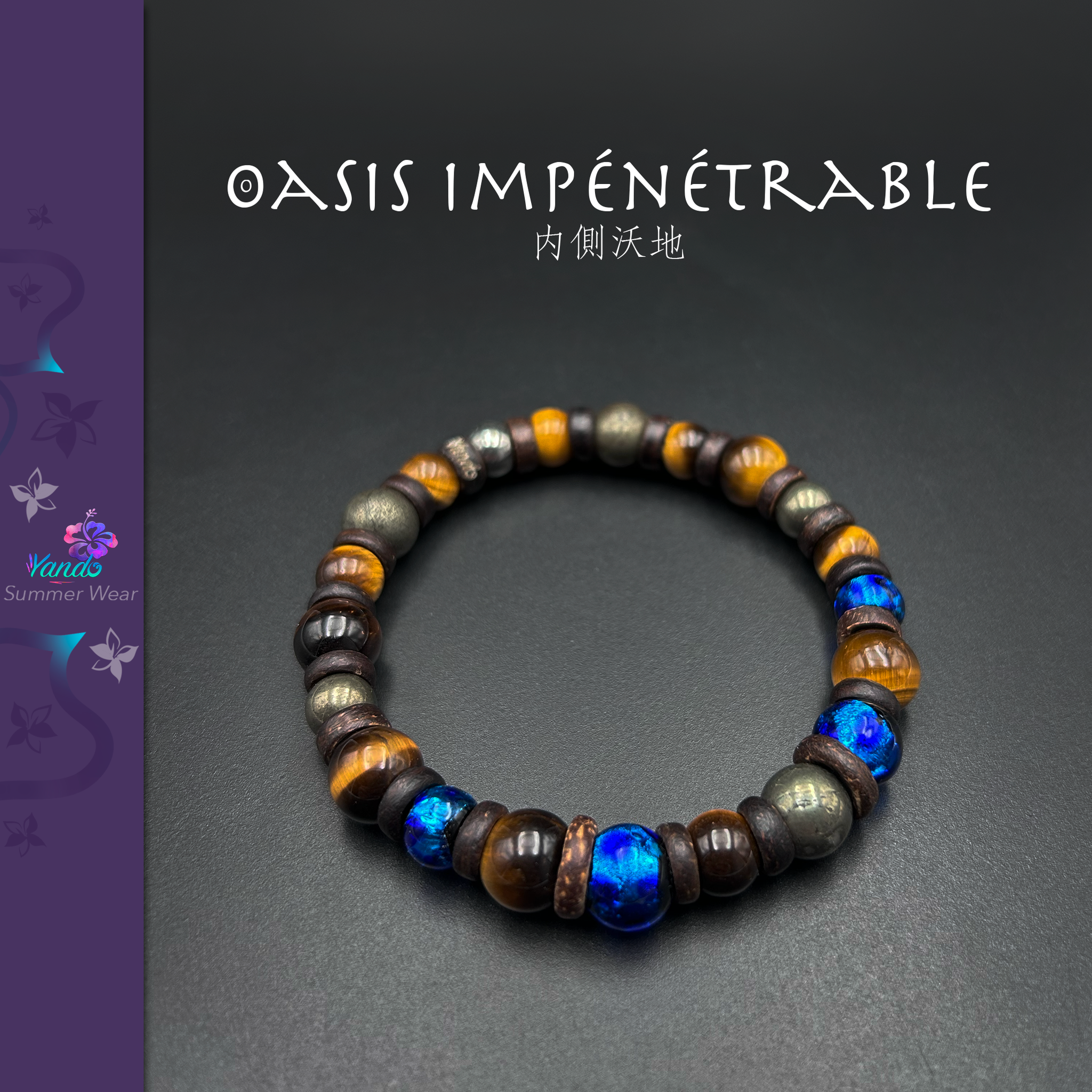 Composition du bracelet : Oeil du tigre, Pyrite, Hotaru Grand Bleu, rondelles de coconut dont une gravée Yando le tout monté sur fil multibrin doublé. Variations du diamètre des perles de 8mm à 10mm.