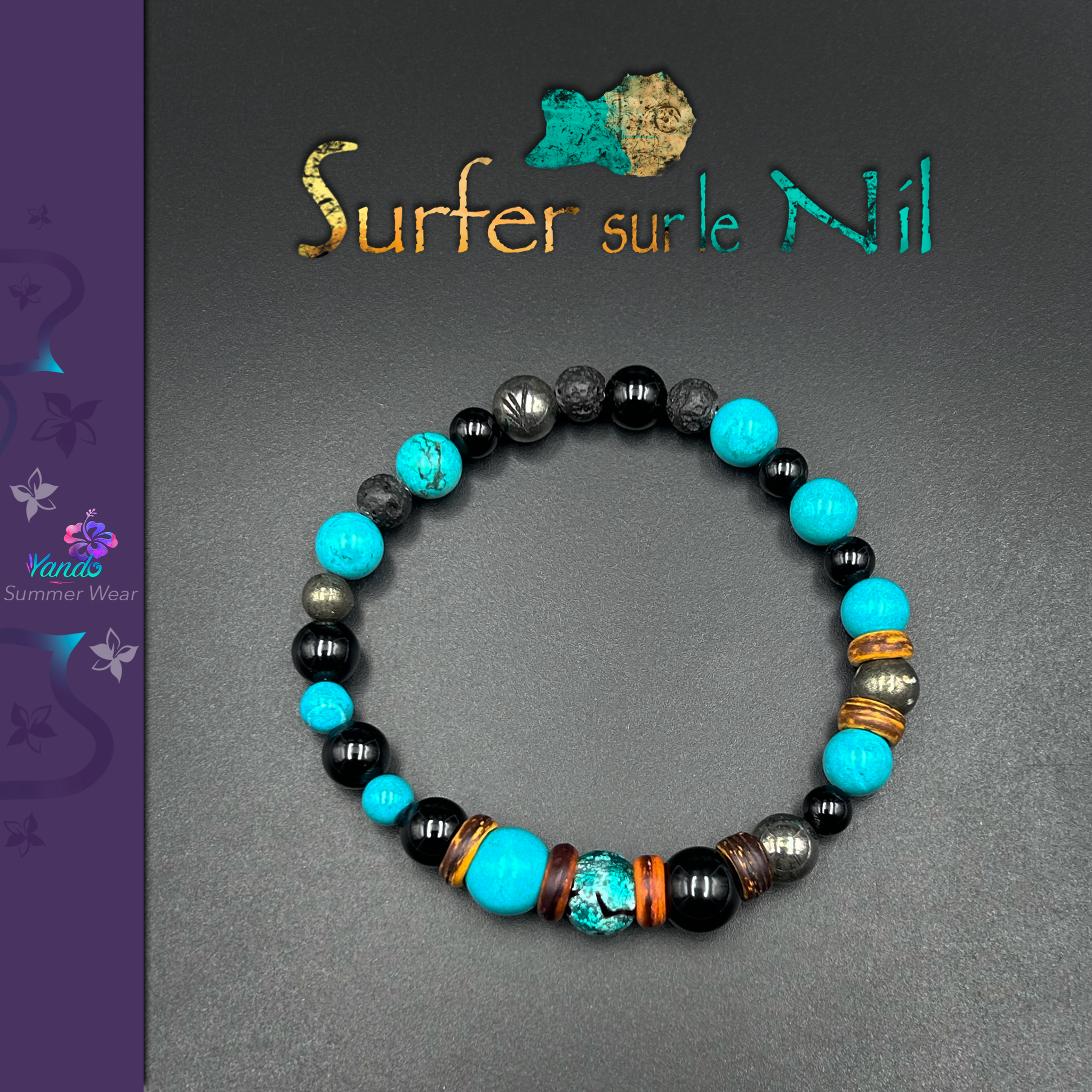 Composition du bracelet : Turquoise 10,8mm, Onyx matte et brillante 10, 8 et 4mm, Pyrite 10,8,4mm, Hotaru Lagon Secret 10mm, rondelles de bois de coco incurvées dont une gravée Yando le tout monté sur fil multibrin doublé.