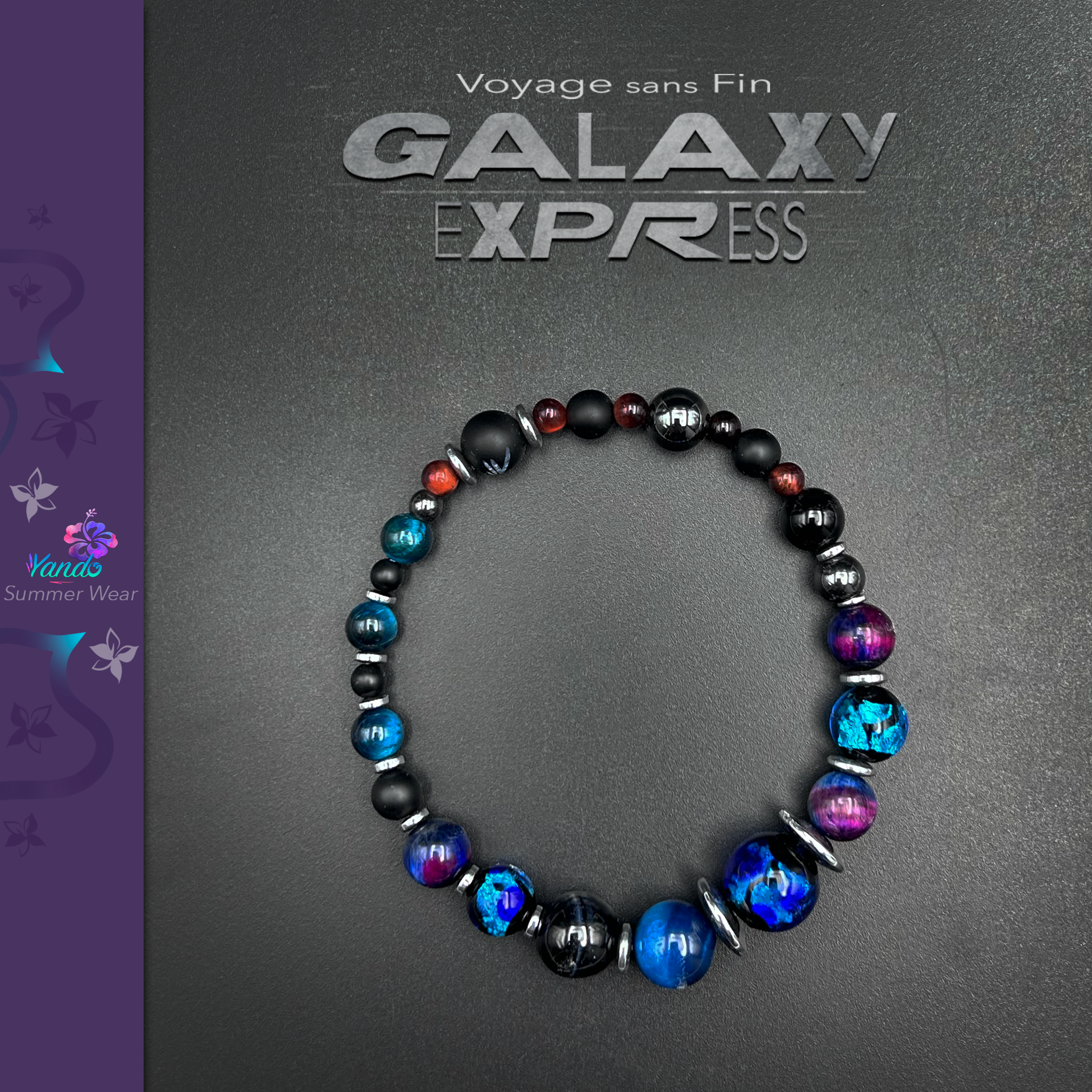 Composition du bracelet : Onyx, Hématite, oeil de faucon, oeil de tigre galaxy, oeil de taureau, Hotaru Grand Bleu et Motoblue, rondelle de coco gravée Yando le tout monté sur fil multibrin doublé.